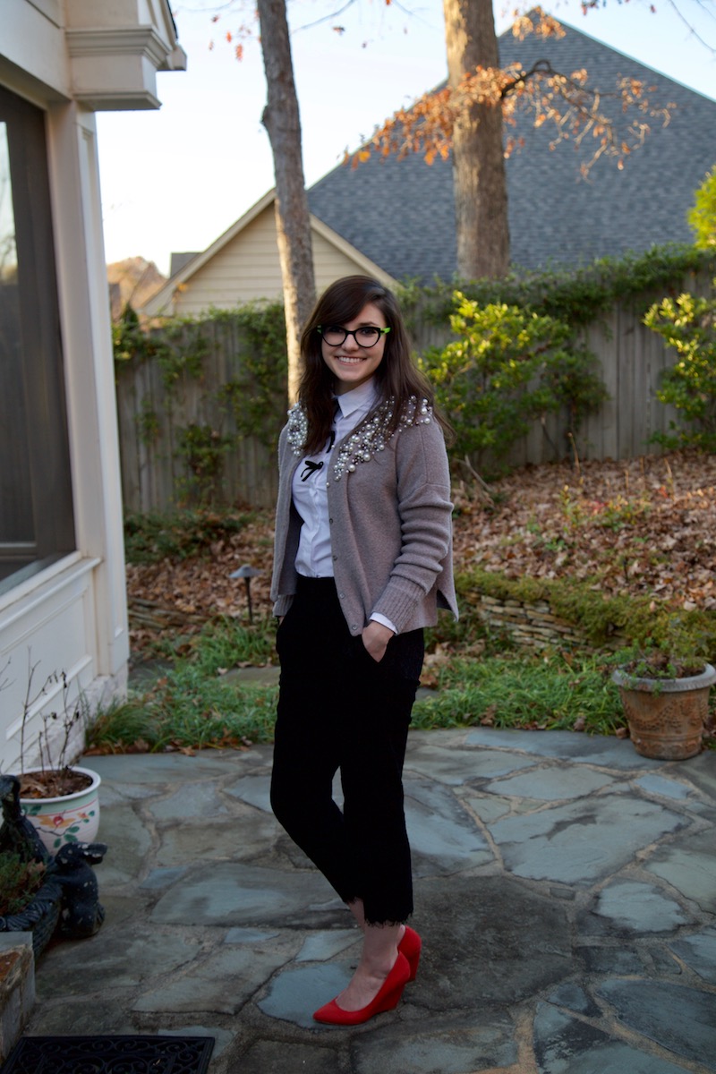 I know I wear a lot of skirts and dresses, but they typically aren’t my go-to. I love skirts and dresses, but I normally gravitate towards pants. Since entering the work-force, I’ve started to wear pants less and less because I find that dress pants are not always very flattering for me. However, I have just recently found these pants as well as another pair that I’ve just added to my wardrobe. They are high-waisted and a little cropped, but they hit at just the right place for me. I love that they are lace because it gives them a girly detail that I am always looking for in an outfit. A white button-down with some interesting details and a girly but oversized cardigan were the perfect accompaniments. Now I still felt like I needed to wear heels just so I didn’t feel stumpy, but I love any excuse to wear heels.