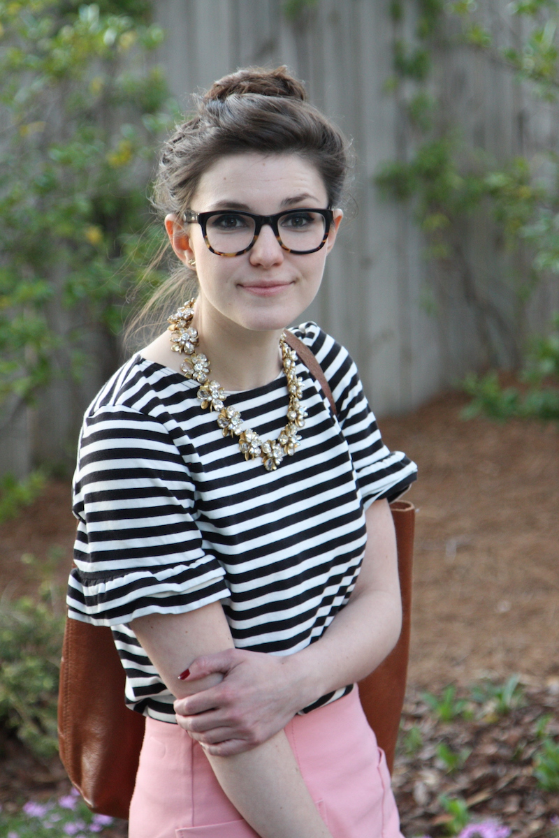 This is another good top that is a little thicker. Plus, it is a classic feminine look with the peter pan collar and tweed material. I love pairing this top with lots of pink accessories.